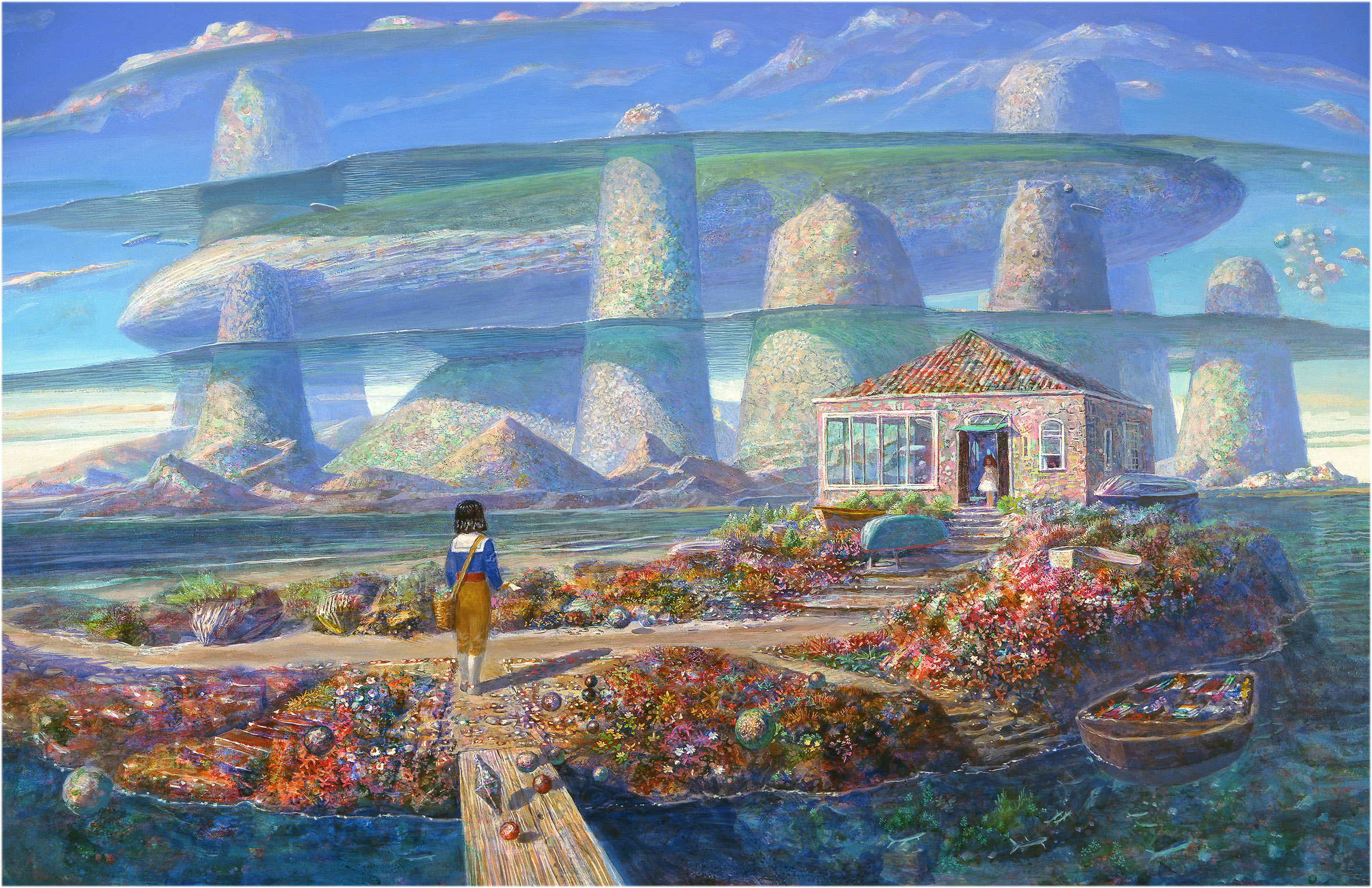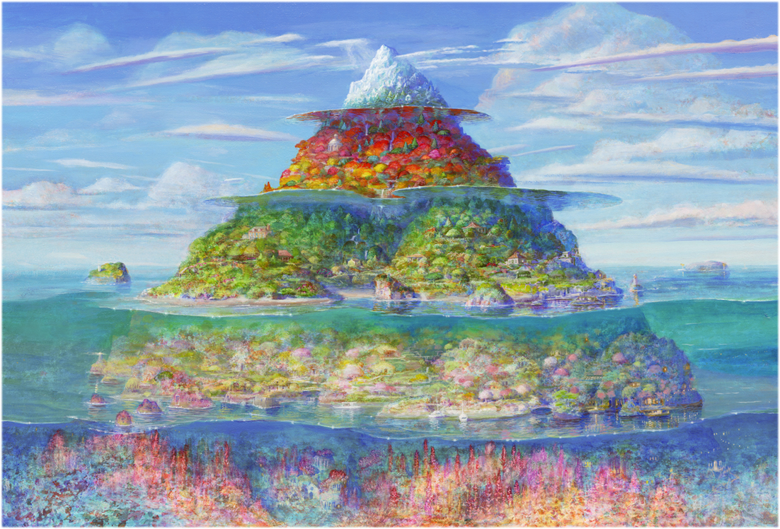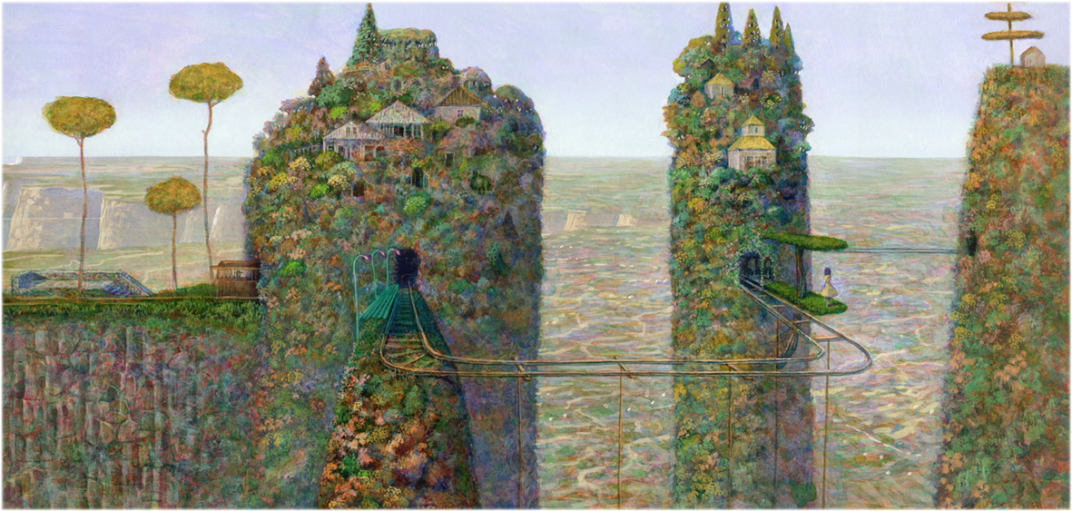 Naohisa Inoue is a Japanese painter known for his imaginary world Iblard. His dreamlike landscapes are filled with poetic atmosphere, light, and quiet wonder. Through delicate color and imaginative architecture, he invites viewers into a world between reality and fantasy. He was born in Osaka in 1948.